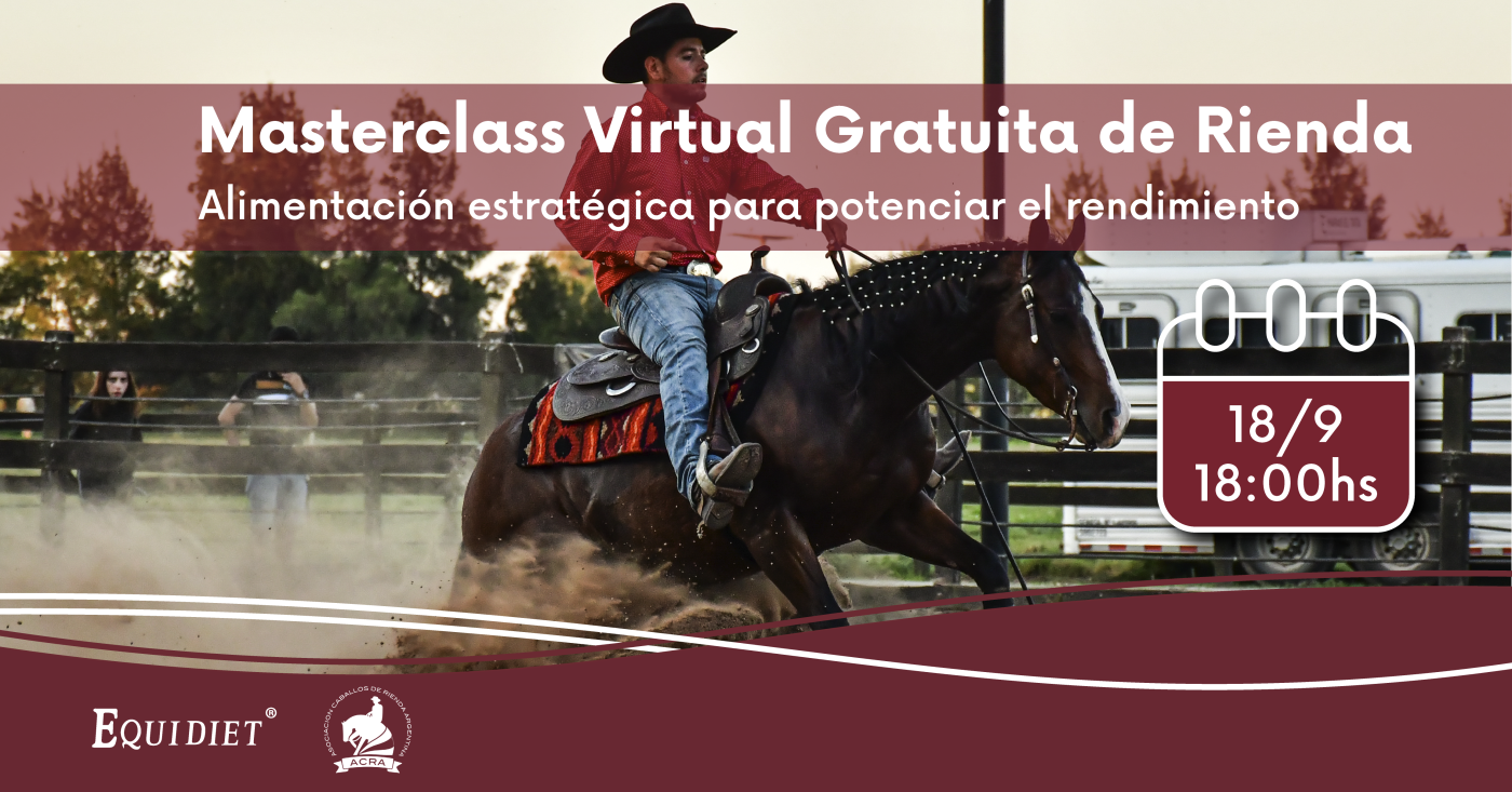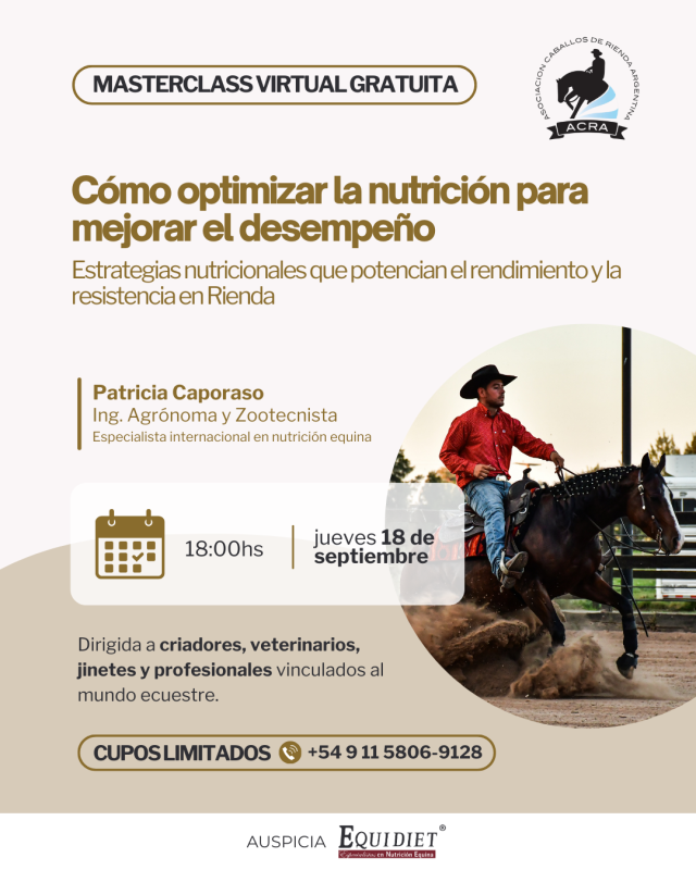 El próximo 18 de septiembre a las 18:00 hs, se realizará una nueva masterclass gratuita de nutrición equina, esta vez organizada junto a @acrariendaargentina y dirigida especialmente a quienes se dedican a la disciplina de la rienda.