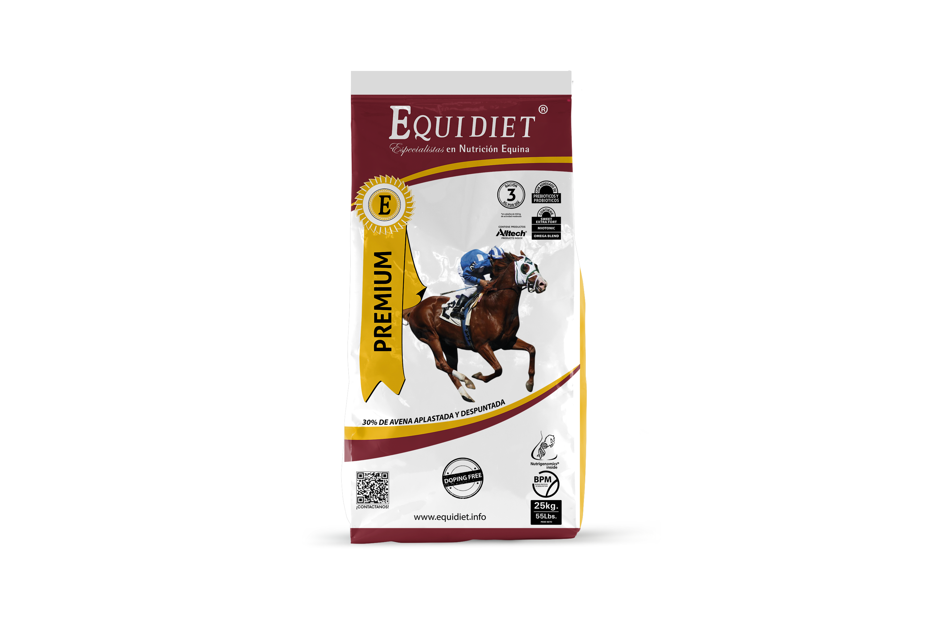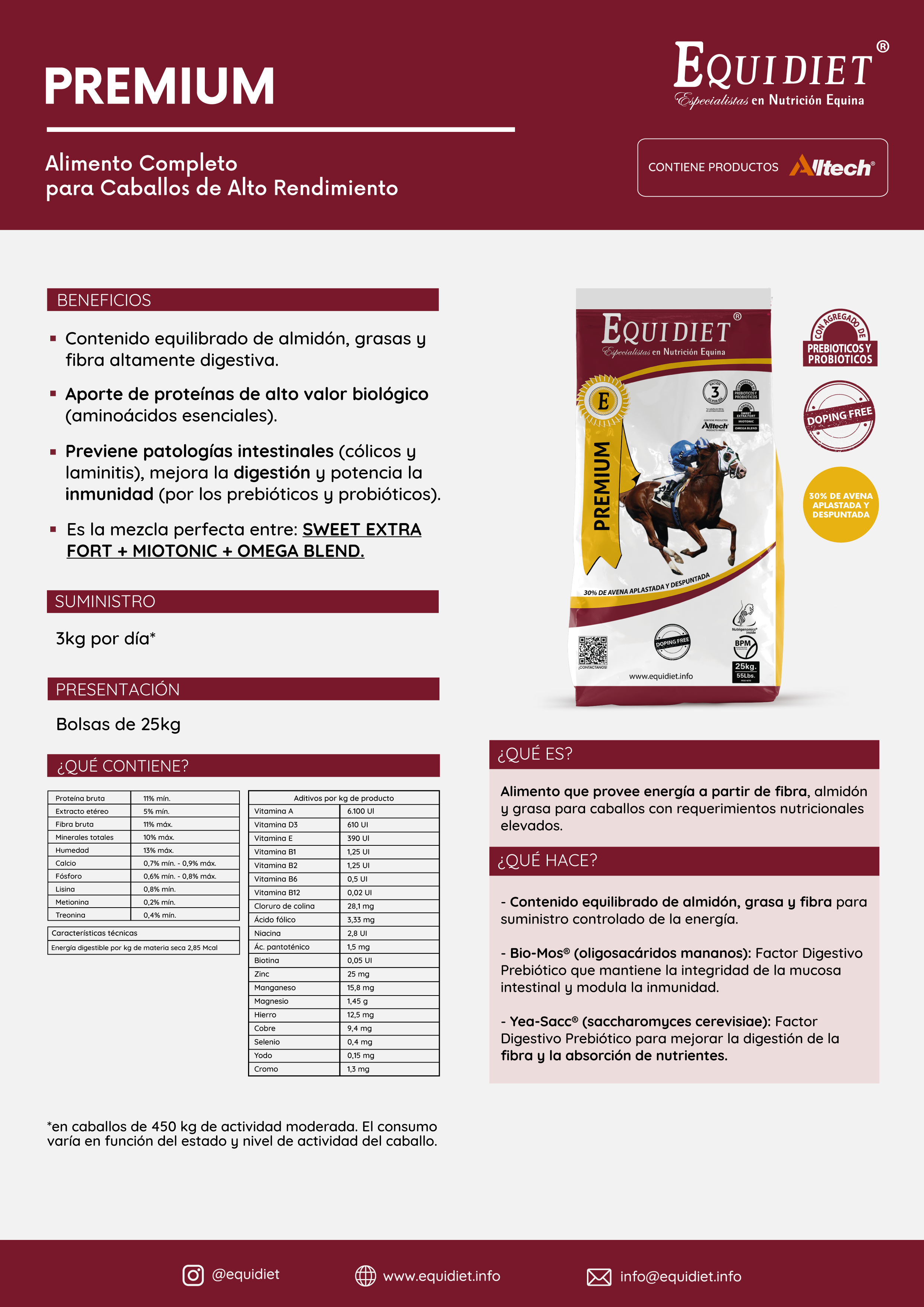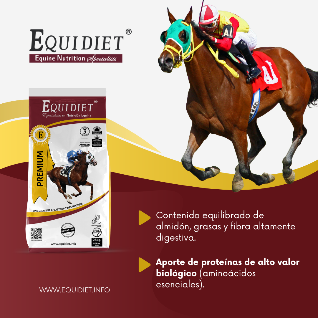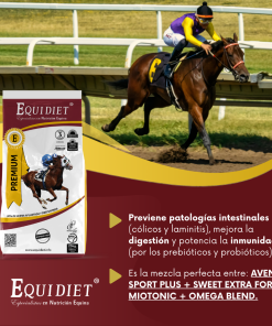 - Previene patologías intestinales (cólicos y laminitis), mejora la digestión y potencia la inmunidad (por los prebióticos y probióticos).