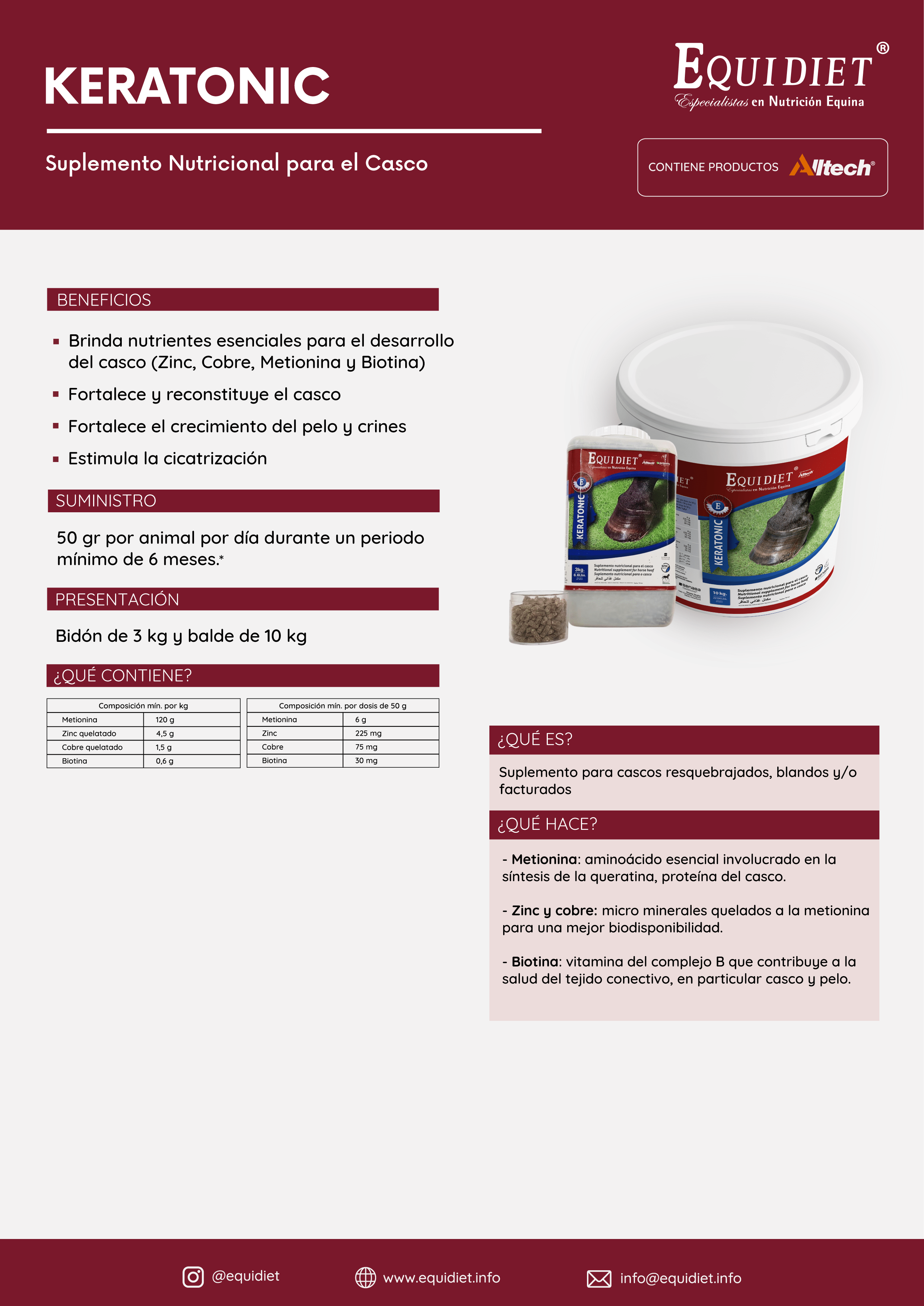 - Contribuye a la salud del tejido conectivo (Casco y pelo)