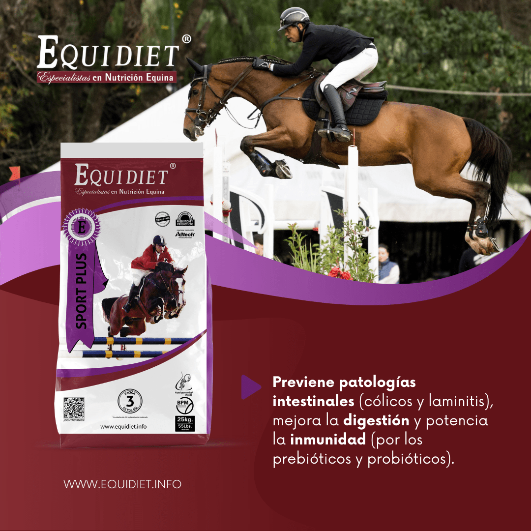 • Previene patologías intestinales (cólicos y laminitis), mejora la digestión y potencia la inmunidad (por los prebióticos y probióticos).