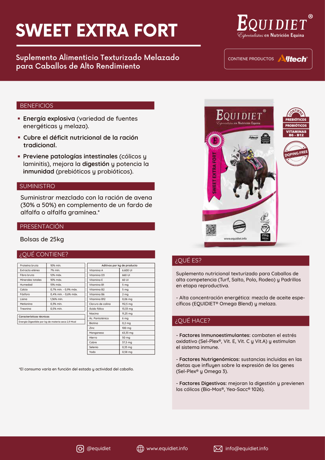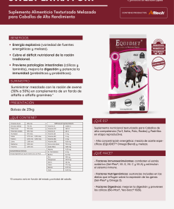 - Previene patologías intestinales (cólicos y laminitis), mejora la digestión y potencia la inmunidad (por los prebióticos y probióticos).