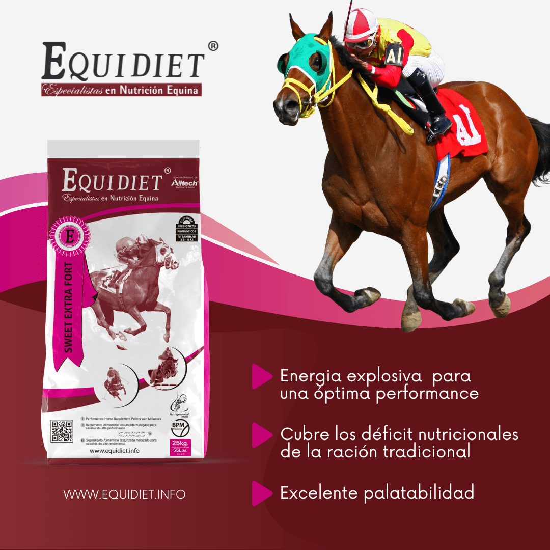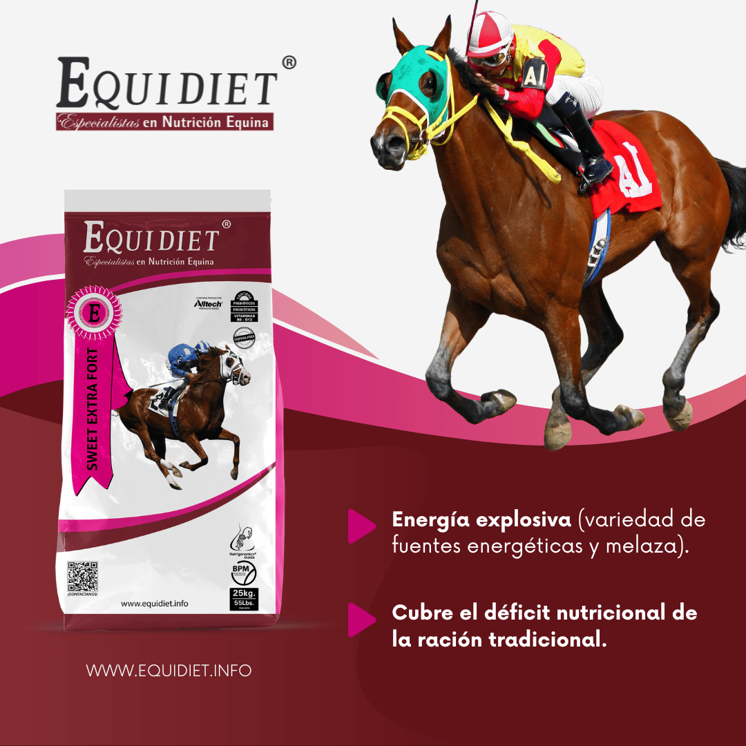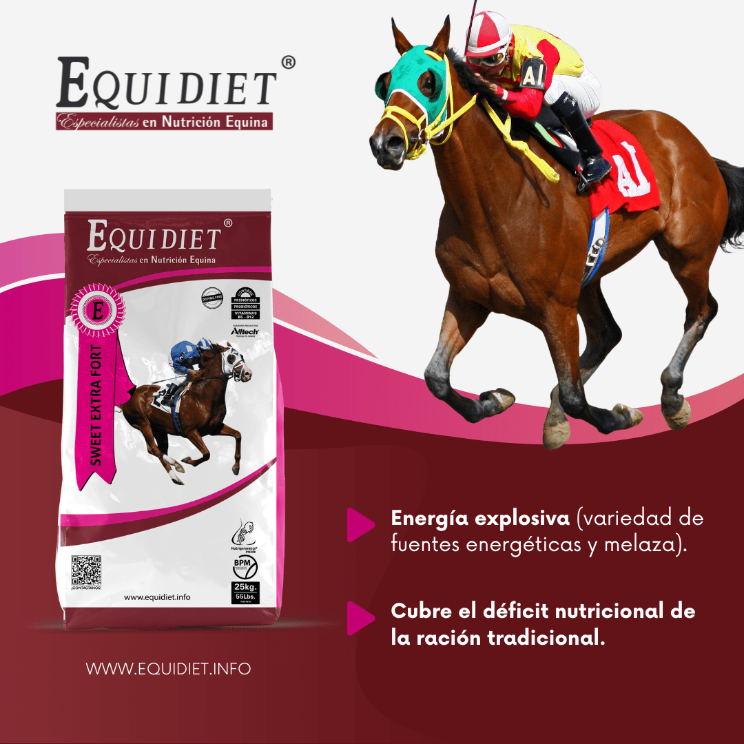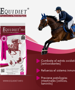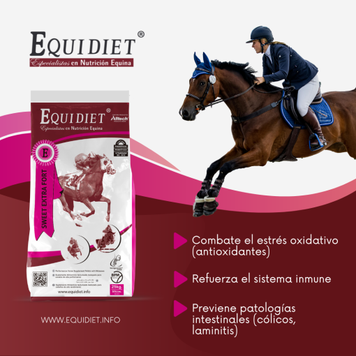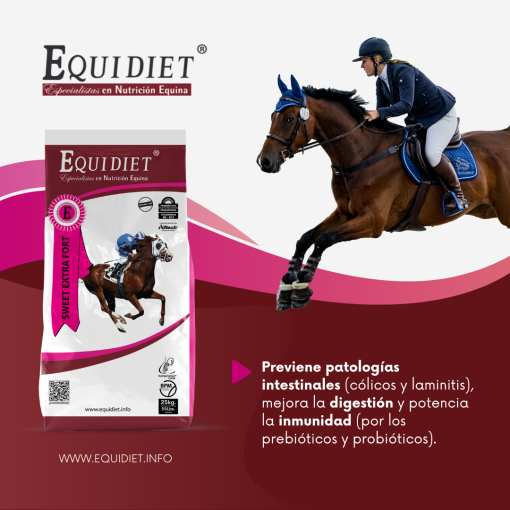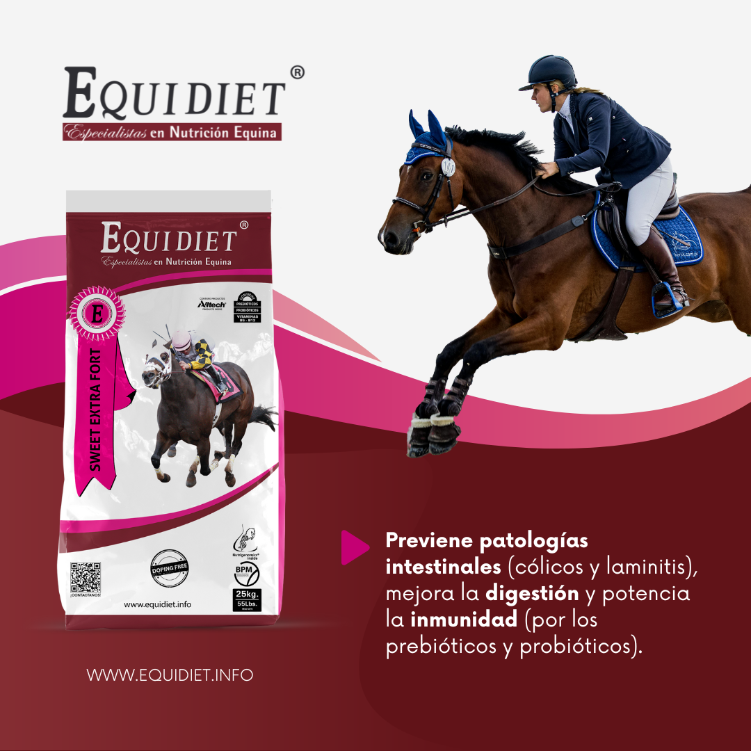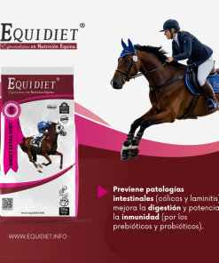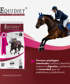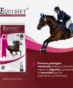 - Previene patologías intestinales (cólicos y laminitis), mejora la digestión y potencia la inmunidad (por los prebióticos y probióticos).