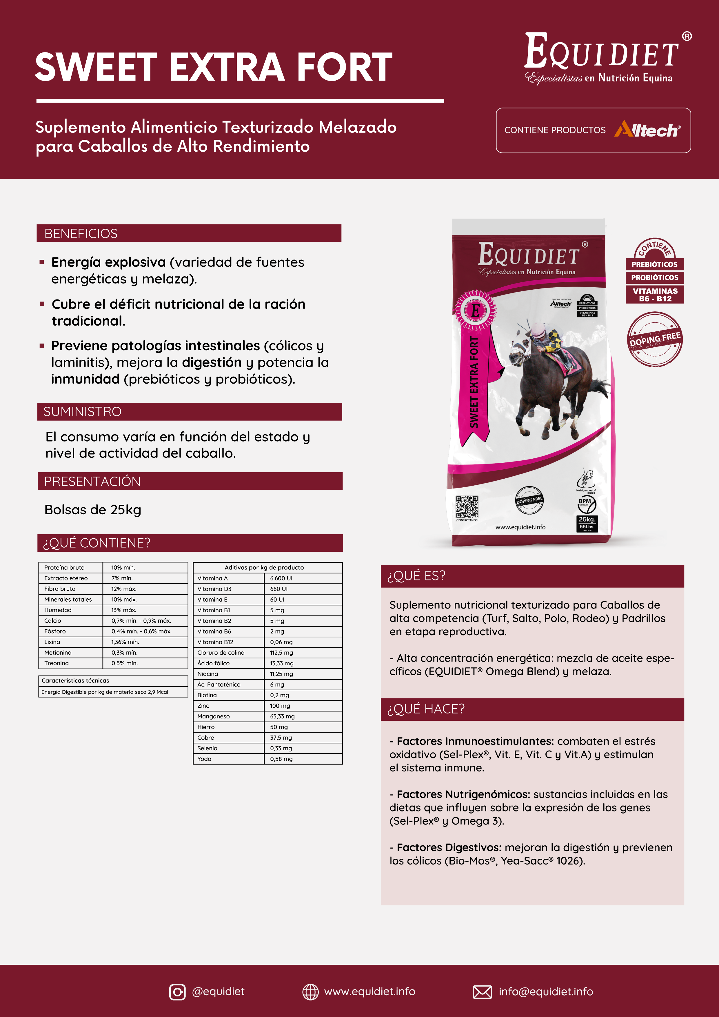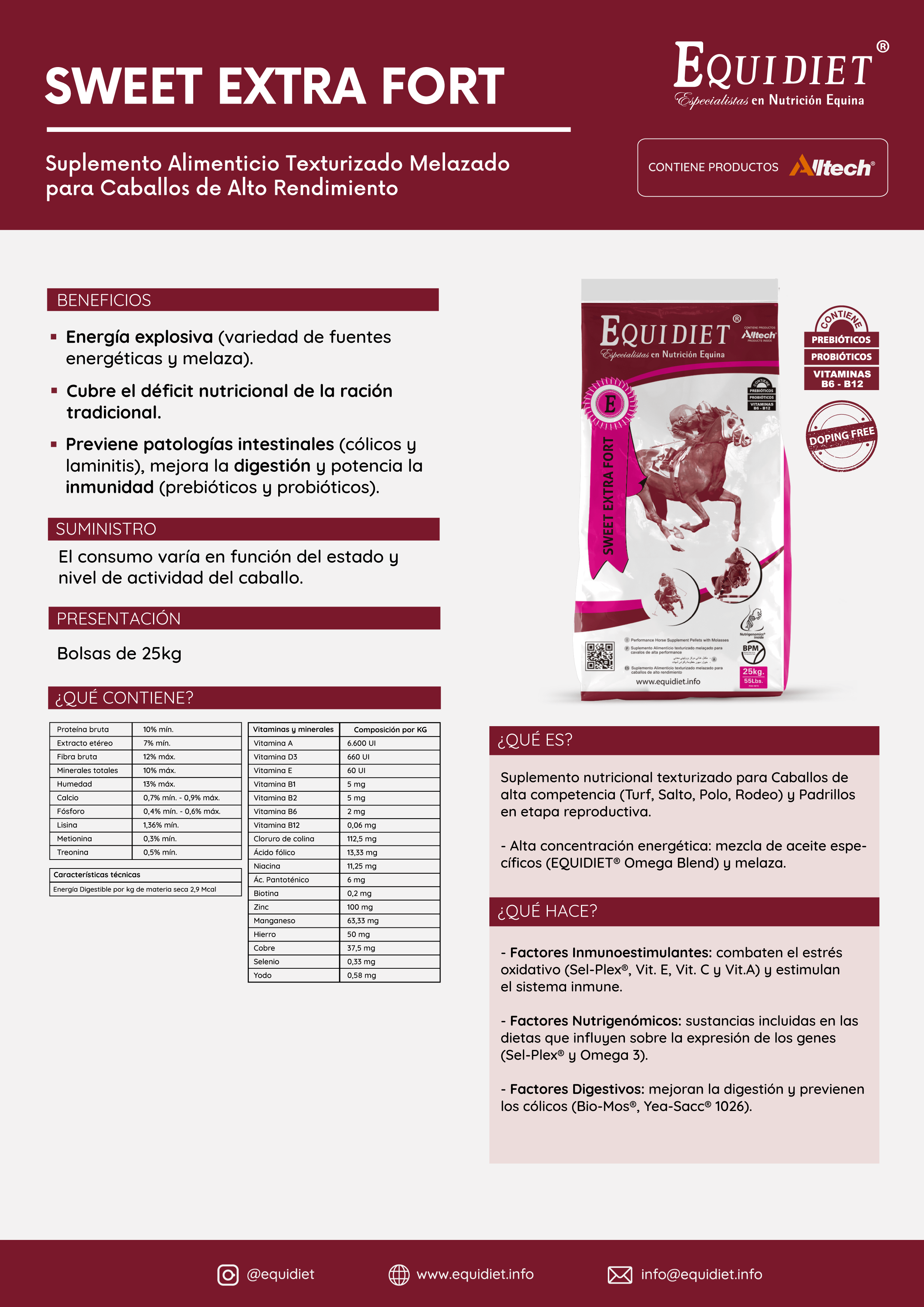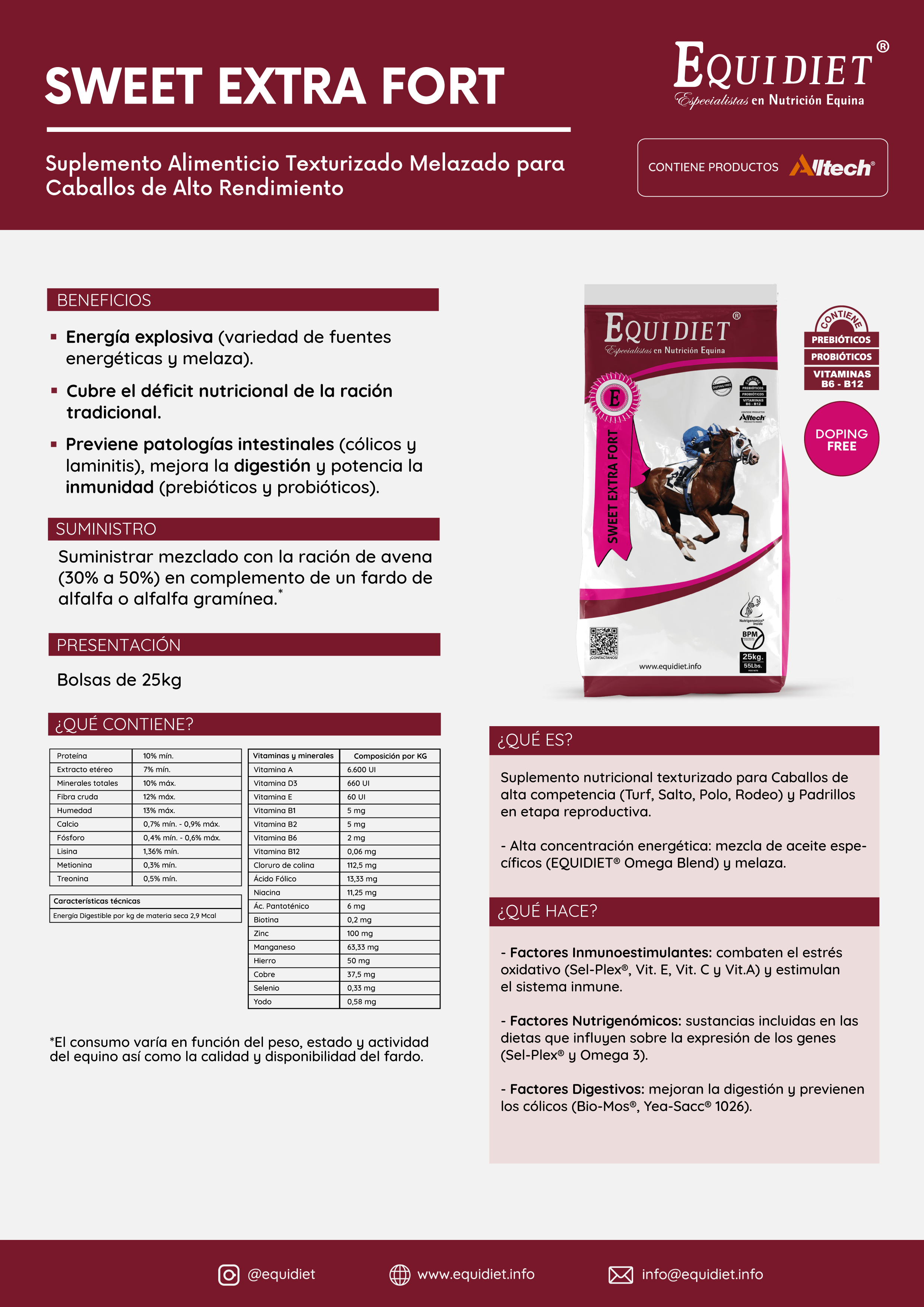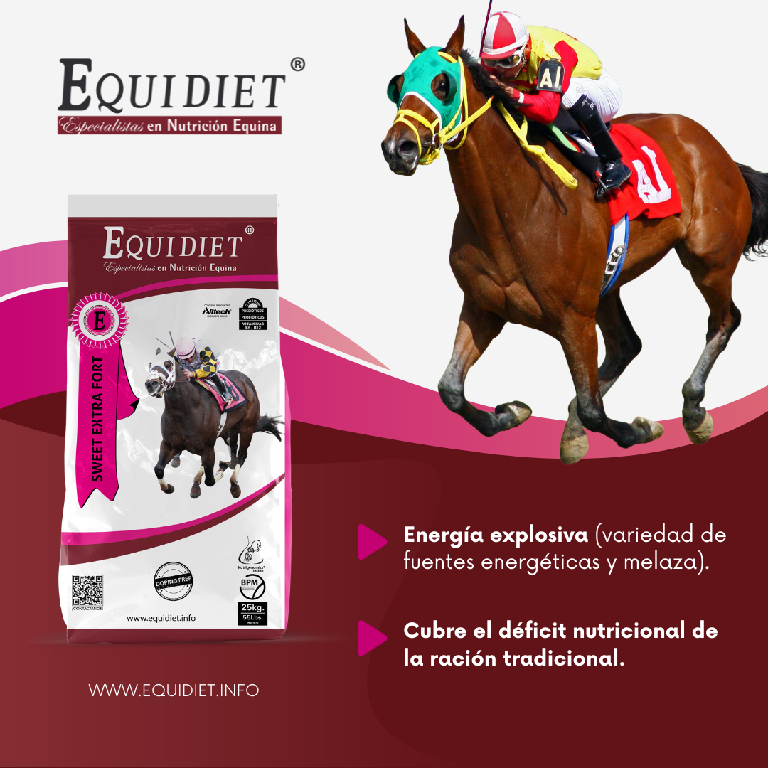 - Previene patologías intestinales (cólicos y laminitis), mejora la digestión y potencia la inmunidad (por los prebióticos y probióticos).